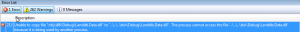 Have you ever gotten this error with Visual Studio 2008? This is a very frustrating error because it will not allow you to build your project unless you shut down studio and restart it, but this should not be so. I have tried lots of things to make this go away but to no avail. If anybody has a solution to make this go away for good I am all ears because from my understanding, this problem has been around for quite some time with Visual Studio.