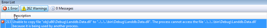 Unable to copy file “obj\x86\Debug\whatever.dll” to “..\bin\Debug\whatever.dll”. The proces cannot access the file “..\bin\Debug\whatever.dll” because it is being used by another process”